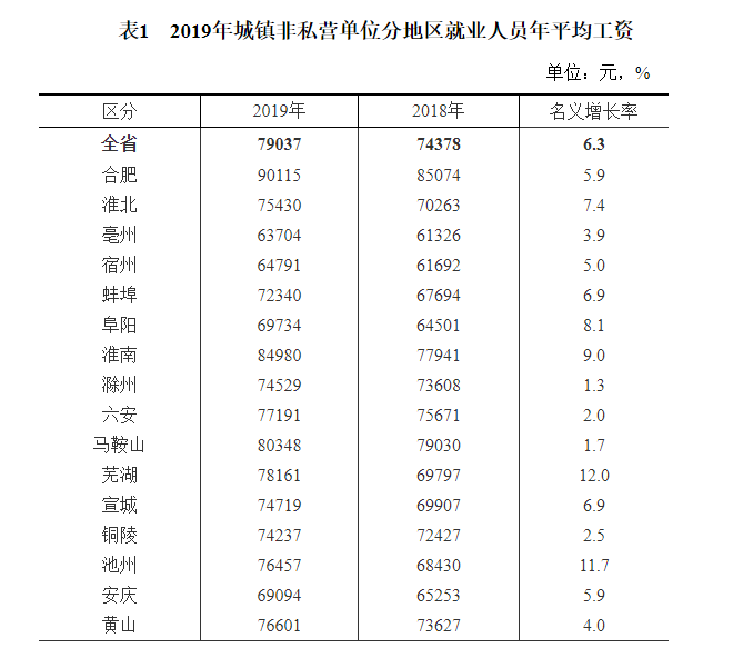 近日 省統(tǒng)計(jì)局發(fā)布數(shù)據(jù) 2019年安徽省城鎮(zhèn)非私營(yíng)單位 就業(yè)人員年平均工資79037元 與2018年74378元相比 增加4659元 同比名義增長(zhǎng)6.3% 其中 在崗職工年平均工資82127元 同比名義增長(zhǎng)6.4% 扣除物價(jià)因素 2019年全省城鎮(zhèn)非私營(yíng)單位 就業(yè)人員年平均工資實(shí)際增長(zhǎng)3.5% 分地區(qū)看 2019年年平均工資 位居前三位的是合肥、淮南、馬鞍山 分別為90115元、84980元、80348元 位列后三位的是亳州、宿州、安慶 分別為63704元、64791元、69094元 同比名義增長(zhǎng)率 位居前三位的是蕪湖、池州、淮南 分別增長(zhǎng)12.0%、11.7%、9.0% 位列后三位的是滁州、馬鞍山、六安 分別增長(zhǎng)1.3%、1.7%、2.0%