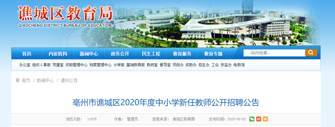 譙城區(qū)計劃面向社會公開招聘中小學(xué)教師145名