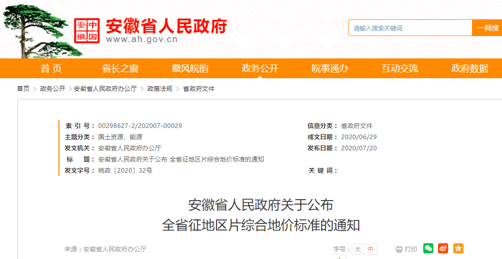 7月20日 安徽省政府網(wǎng)站發(fā)布 《安徽省人民政府關(guān)于公布 全省征地區(qū)片綜合地價標(biāo)準(zhǔn)的通知》 通知全文如下