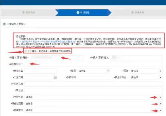 2、輸入家長信息及新生信息,和其他基本表單要素信息,選擇現(xiàn)住址范圍,系統(tǒng)自動對應所屬學校,選擇其中一所即可