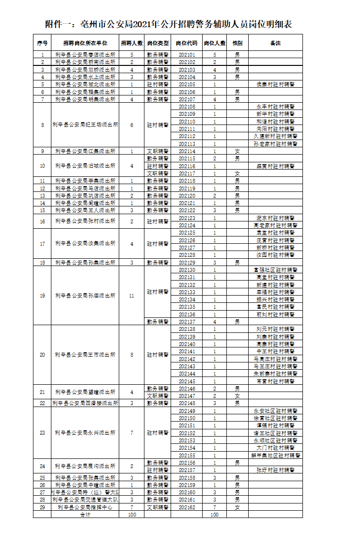 本次輔警計(jì)劃招聘具體單位、招聘人數(shù)、崗位設(shè)置、性別要求等信息,詳見附件一《亳州市公安局2021年公開招聘警務(wù)輔助人員崗位明細(xì)表》。