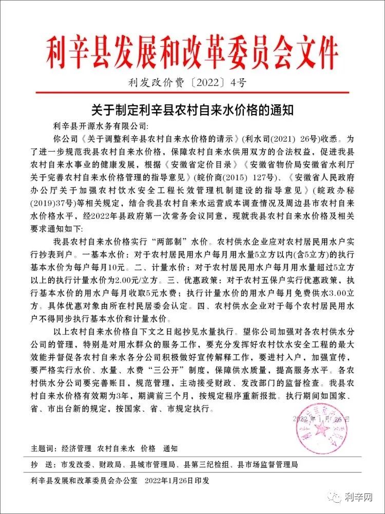 最新!關(guān)于利辛縣農(nóng)村自來水價格的通知...